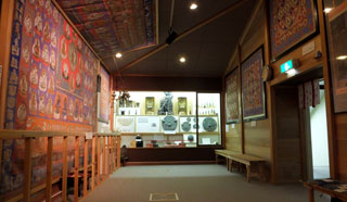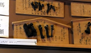 髷額(まげがく)は、航海を無事乗り切った船頭たちが、お礼参りに納めたもので、自らの髷(まげ)を絵馬にして奉納したものです。人々の生活の中に、信仰が深く関わっていたのを感じさせます。毛髪刺繍八相釈尊涅槃図は、1904年(明治37年)、8万4千人の毛髪を使用して、5年をかけて作成されたものです。繊細に織り込まれた刺繍は、見るものを驚嘆させます。
