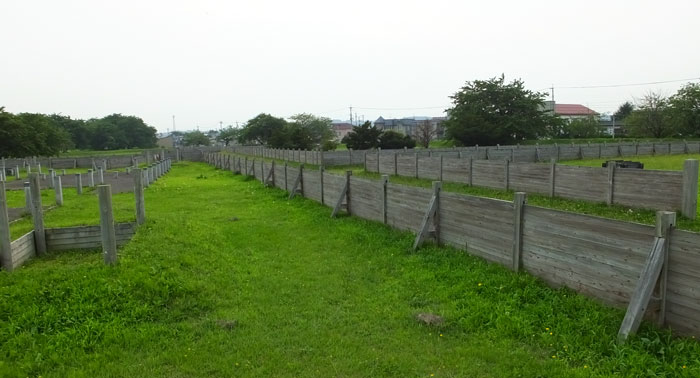 天正6年(1578)7月、大浦為信は浪岡城主である北畠顕村(あきむら)を討ち取ります。当時、北館は屋敷町のように規則的に区画されていました。現在は板塀で再現されており案内板によって説明されています。それは迷路状の道となっており、内館までの通路をわかりにくくしたといわれています。一つの区間には、地面に掘った穴に柱を直接埋めて建てる「掘立柱建物(ほったてばしらたてもの)」と呼ばれる大きな建物が1軒。地面を掘り下げて地下に床を作る「竪穴建物(たてあなたてもの)」と呼ばれる小さな建物が数軒。深さ4〜5mほどの井戸が1つあったそうです。石垣や天守閣ができ上がる以前から城の中心を守る工夫がされていたことがよく分かります。