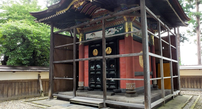 本堂の左手には、為信の霊屋があります。建立された当時は質素なものであったようですが、文化年間の修理によって、現在の極彩色の華やかな姿になったようです。現在、非公開となっている霊屋内部の壁は、板卒塔婆に囲まれており、そこには宝篋印塔(ほうきょういんとう)と呼ばれる供養塔が安置されています。